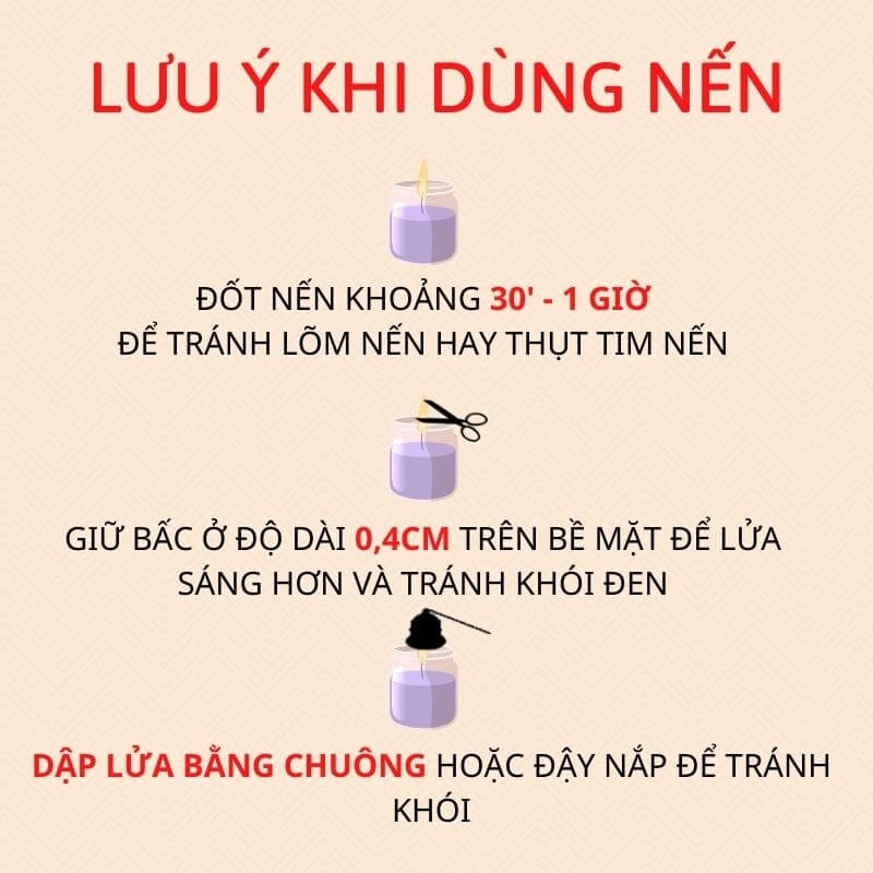 1.Trước khi đốt, cắt bấc bằng kéo, để bấc dài từ 0.4 - 0.6 cm để bấc sạch và cháy đều.Dùng ít hương liệu nên sau khi đốt sẽ chỉ thoang thoảng thơm nhẹ nhàng.