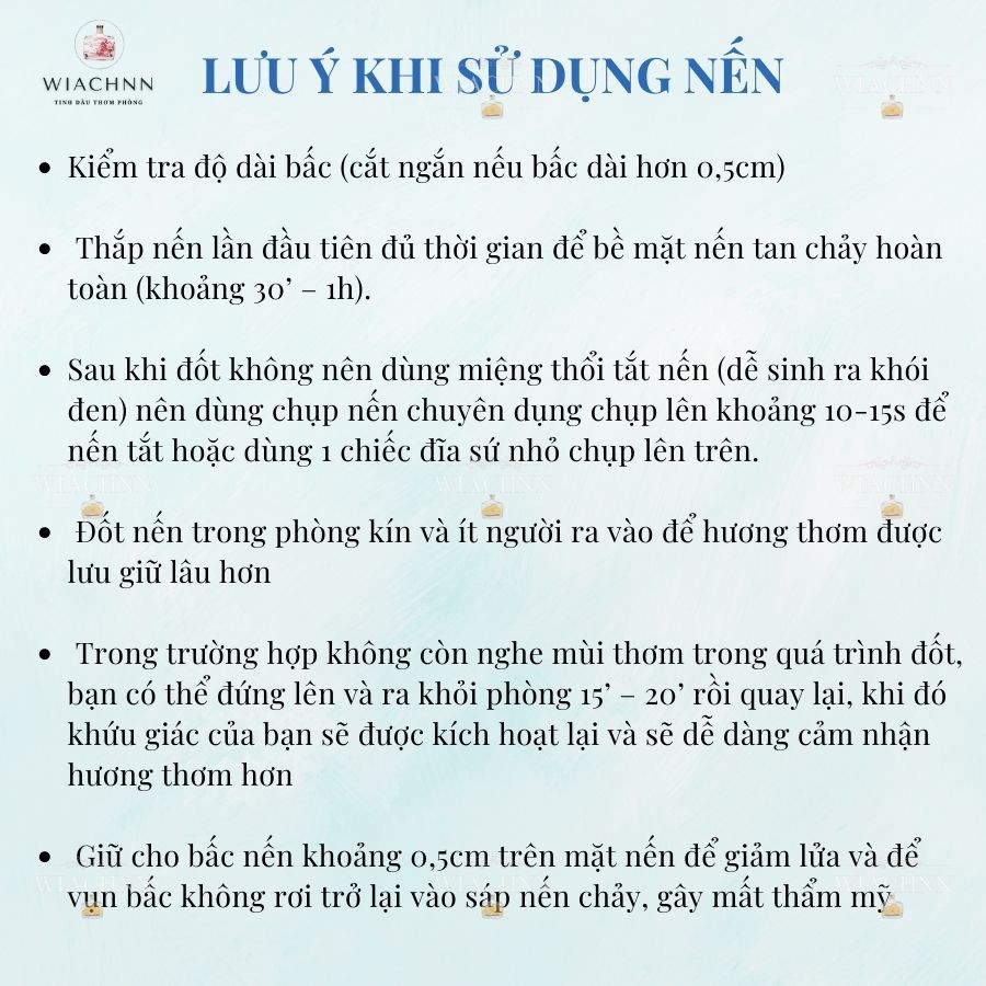 - Đốt nến trước khi vào phòng 15’ – 20’ để cảm nhận mùi thơm rõ ràng hơn. Trong trường hợp không còn nghe mùi thơm trong quá trình đốt, bạn có thể đứng lên và ra khỏi phòng 15’ – 20’ rồi quay lại, khi đó khứu giác của bạn sẽ được kích hoạt lại và sẽ dễ dàng cảm nhận hương thơm hơn