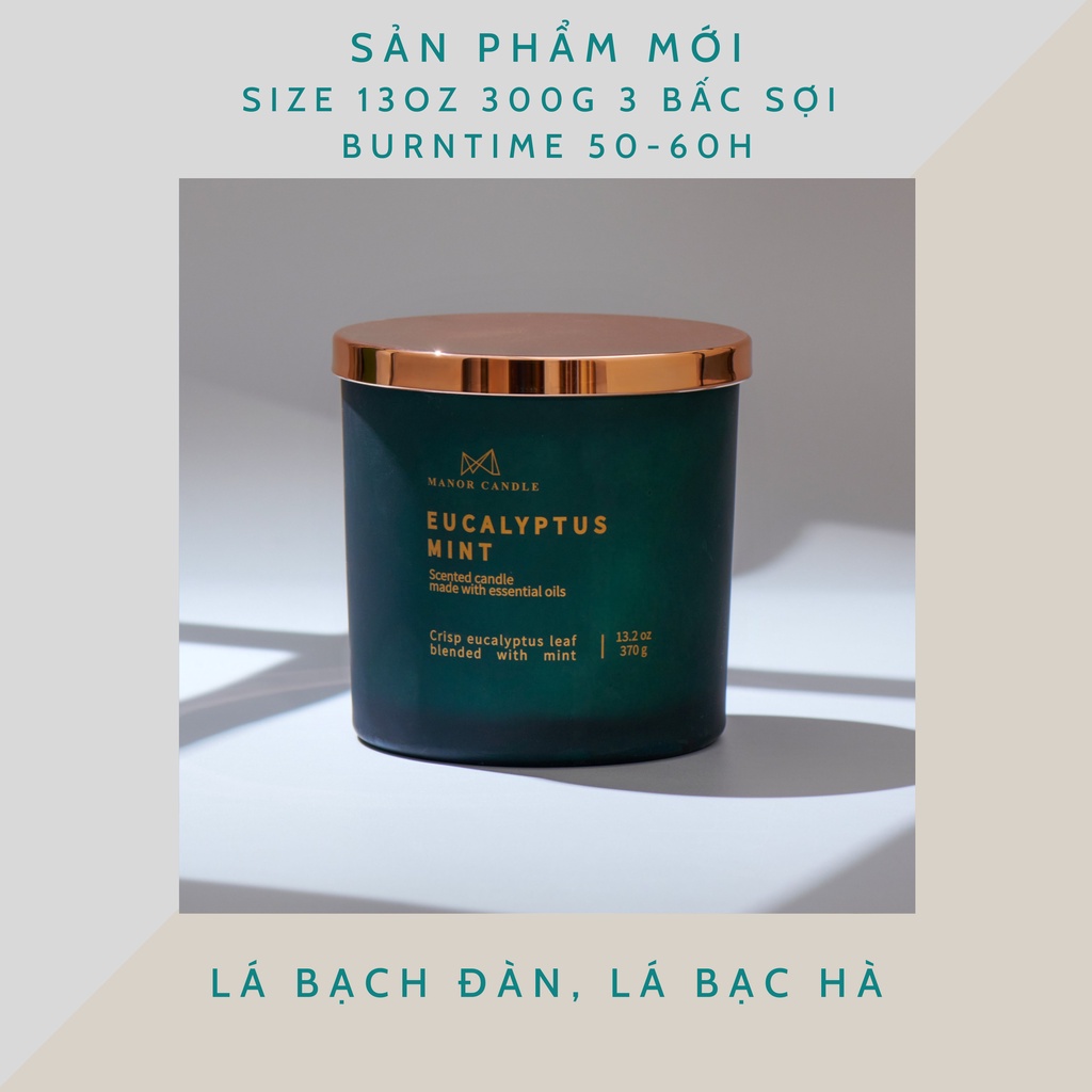 Nến thơm EUCALYPTUS MINT cao cấp không khói an toàn, sáp cọ size 13oz 3 bấc 300gram
