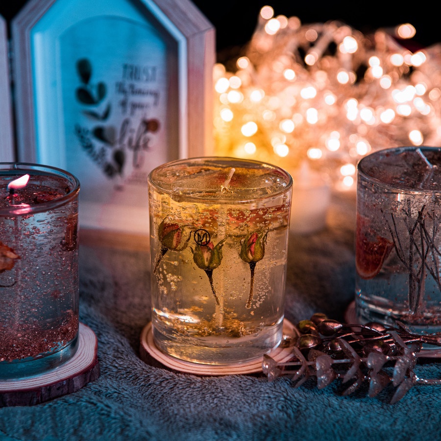 - Nguyên liệu của nến thơm: Làm từ sáp thạch dẻo kết hợp với tinh dầu thơm thư giãn, thân thiện với môi trường.
