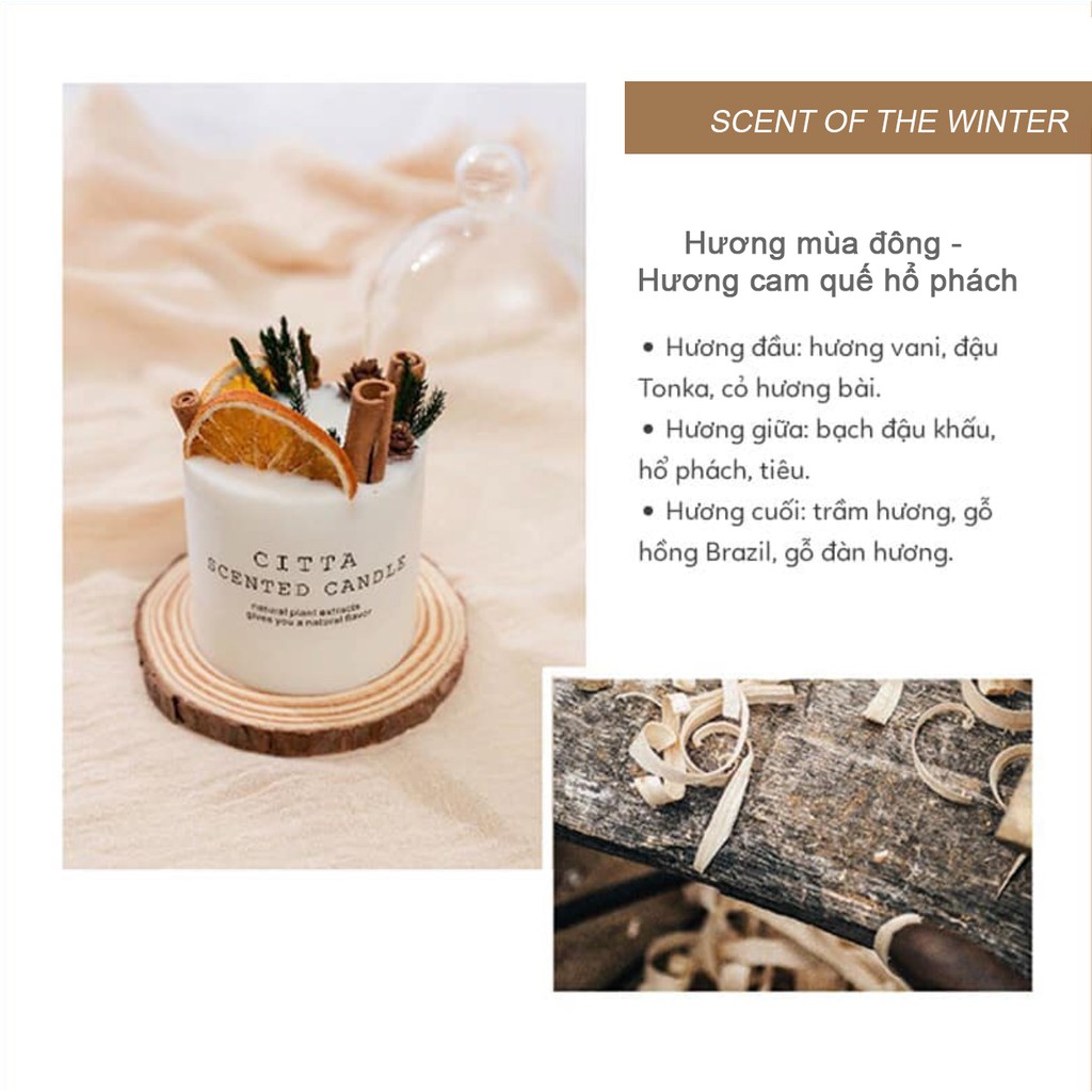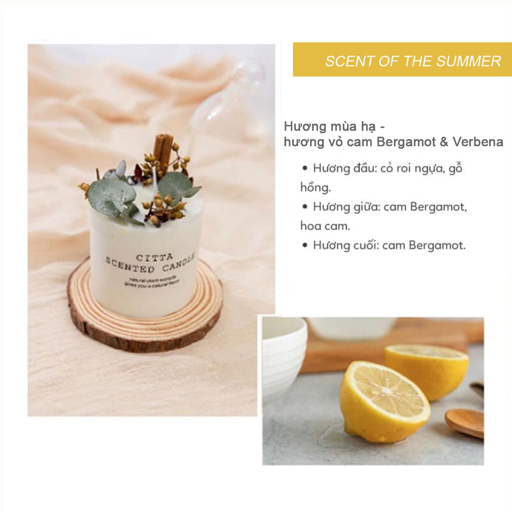 - Hương thơm của nến là sự phối hợp của nhiều mùi hương chiết xuất từ tinh dầu thiên nhiên, đem lại mùi hương khác biệt với 3 tầng hương đầu - giữa - cuối cho từng cây nến