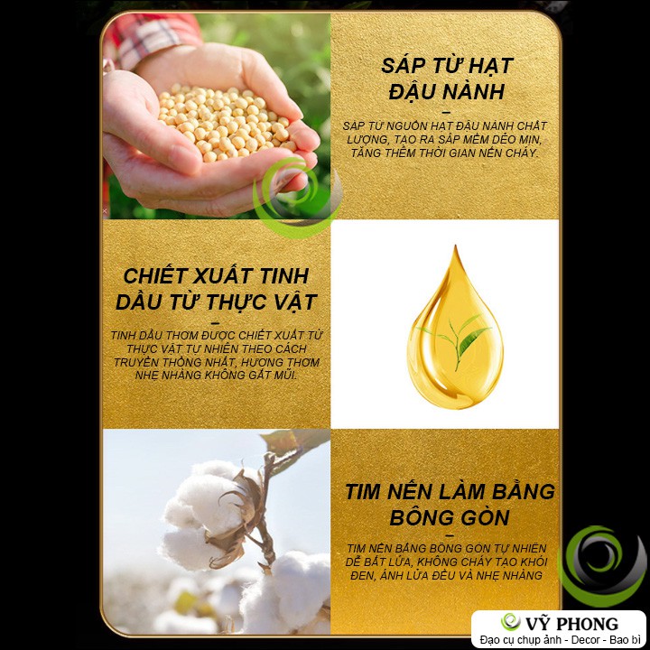 Chất liệu : SÁP NẾN TỪ HẠT ĐẬU NÀNH CHẤT LƯỢNG, TINH DẦU THƠM CHIẾT XUẤT TỪ THỰC VẬT TỰ NHIÊN, TIM NẾN LÀ BÔNG GÒN KHÔNG GÂY KHÓI ĐEN