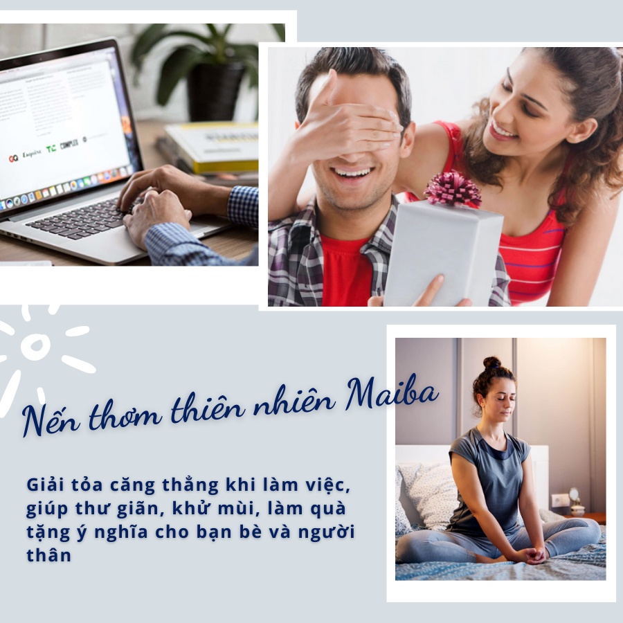 - Nến Thơm MAIBA sáp dừa tự nhiên ba tầng hương giúp giải tỏa stress, căng thẳng, mệt mỏi, thư giãn tinh thần sau mỗi giờ làm việc mệt mỏi, tăng khả năng tập trung.