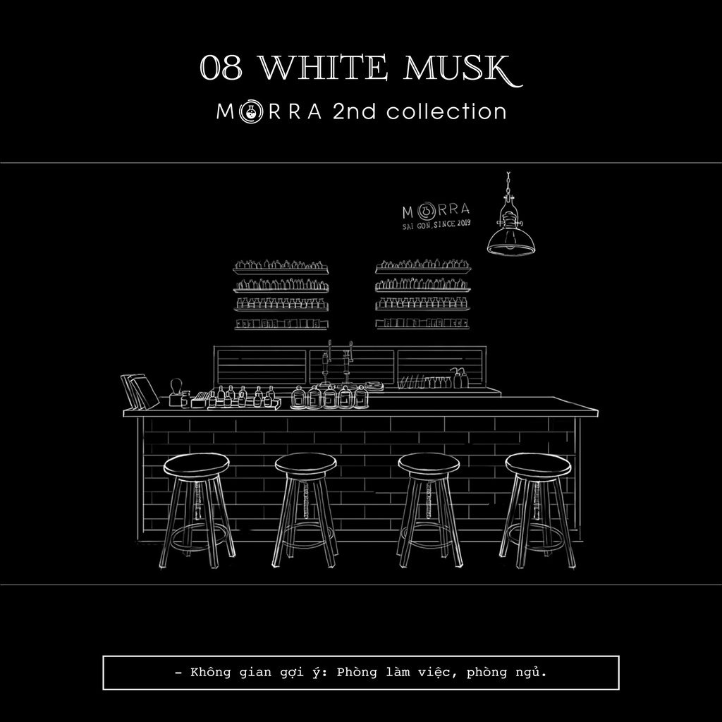 Bầu không khí 08 White Musk mang lại tượng trưng cho dư vị ngọt ngào của những trái Blackberry mọng nước. Kết hợp với sự ấm áp nhẹ nhàng của xạ hương, 08 White Musk hứa hẹn đem đến khu vườn mùa xuân đầy tươi sáng vào trong không gian của bạn.Mùi hương chủ đạo: Xạ hương, Blackberry.