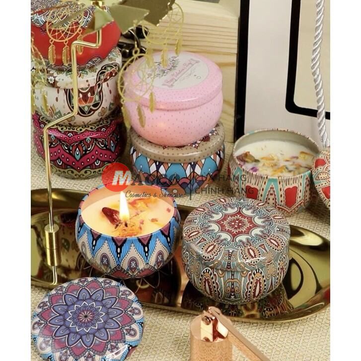 - Nến thơm có vỏ hộp làm từ thiếc trang trí bắt mắt, sang trọng.