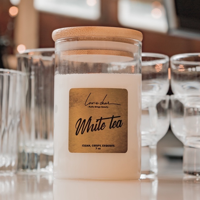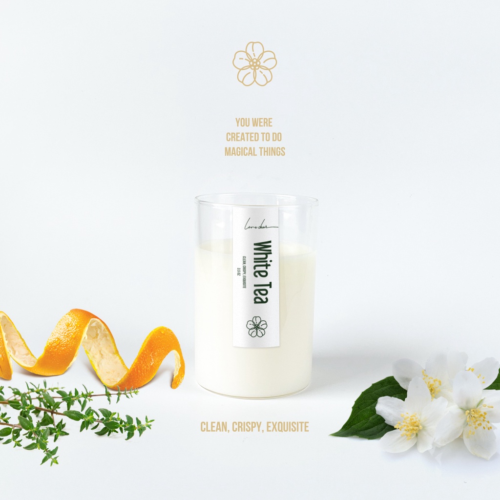 Nến thơm tinh dầu LOVEDEAR - WHITE TEA: Sự giản dị và thanh tao như một tách trà vào sớm ban mai. Hương thơm của trà trắng hoà quyện cùng với sự thanh tao của hoa lài, được điểm xuyết bởi mùi hương từ lá thyme (cỏ xạ hương) và một chút thoảng qua nhè nhẹ của hương cam.
