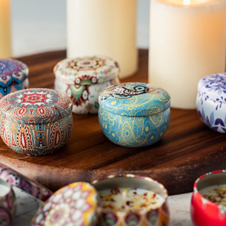- Nến thơm có vỏ hộp làm từ thiếc trang trí bắt mắt, sang trọng