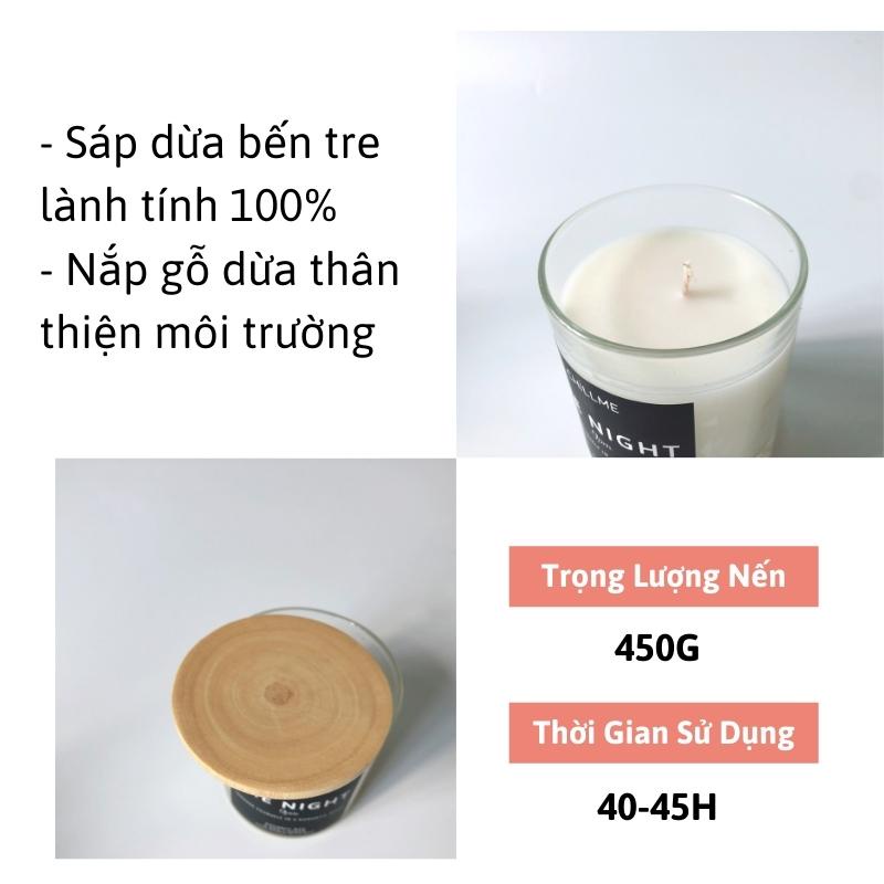 ***Trọng lượng 450G: 220G sáp dừa (cốc thuỷ tinh, bấc cotton, nắp gỗ, ~50h cháy – không gian 15m2 ~ 17m2 )