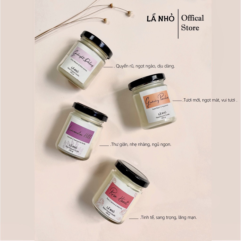 * Tất cả sản phẩm nến thơm thiên nhiên của Lá Nhỏ đều được sản xuất thủ công một cách tỉ mỉ, khéo léo. Với thành phần sáp thiên nhiên: Sáp nành, ong, cọ kết hợp với tinh dầu thiên nhiên và mùi hương nhập khẩu chất lượng. Mong muốn mang lại cho khách hàng các sản phẩm an toàn và sự trải nghiệm tuyệt vời nhất khi sử dụng.* TẤT CẢ CÁC SẢN PHẨM MÙI HƯƠNG ĐỀU ĐƯỢC THIẾT KẾ TỪ NHÀ LÁ NHỎ.