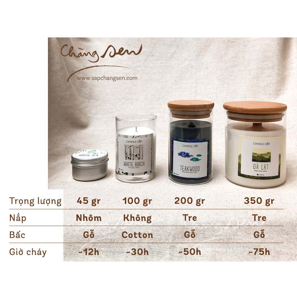• Nắp nhôm, bấc cotton, khoảng 12 giờ cháy
