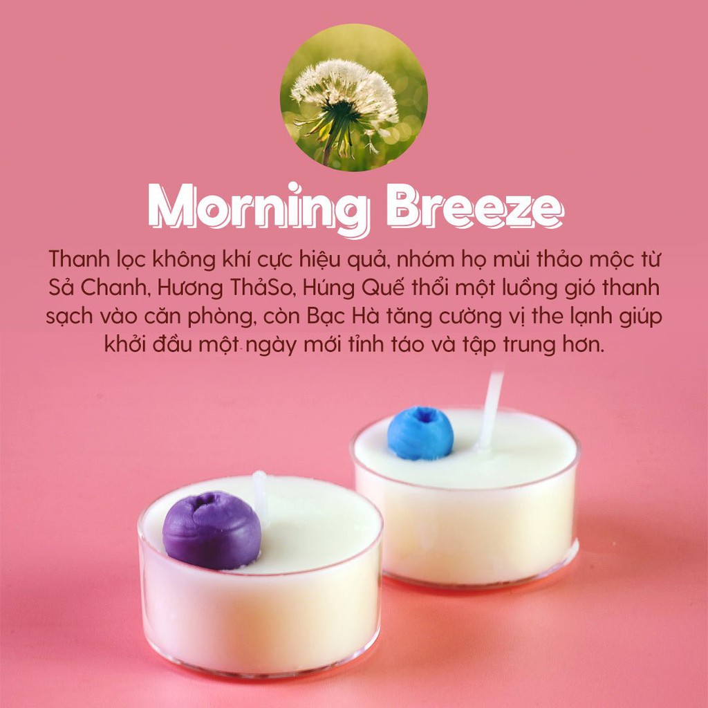 ✔️ Morning Breeze: thanh lọc không khí cực hiệu quả, nhóm họ mùi thảo mộc từ Sả Chanh, Hương Thảo, Húng Quế thổi một luồng gió thanh sạch vào căn phòng, còn Bạc Hà tăng cường vị the lạnh giúp khởi đầu một ngày mới tỉnh táo và tập trung hơn.