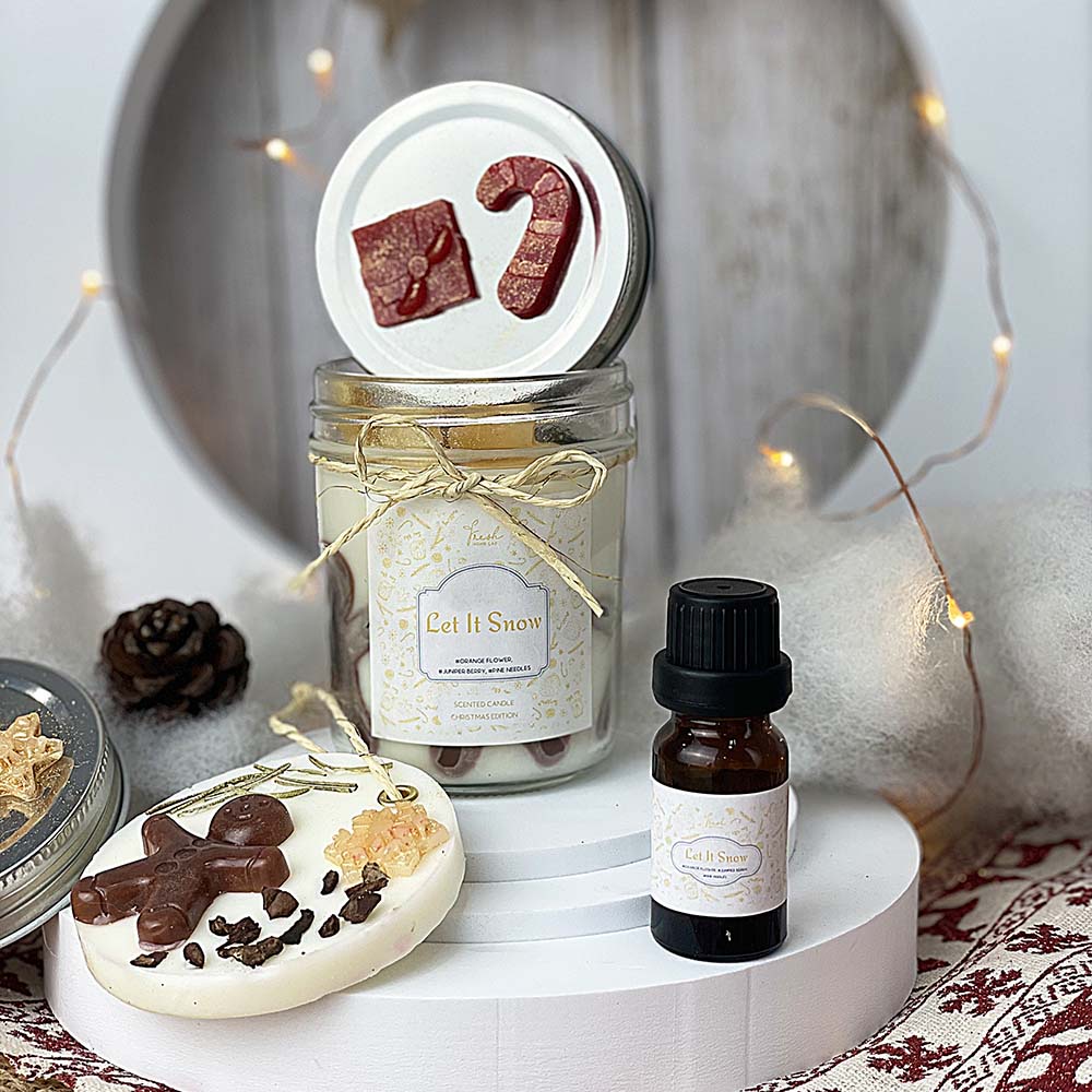 Bộ sưu tập Giáng Sinh với 2 tông mùi Let It Snow và By The Fireplace cho bạn lựa chọn, mang không gian của mùa lễ hội giáng Sinh đến ngôi nhà bạn bằng mùi hương từ các loại tinh dầu thiên nhiên đặc trưng trong dịp này.Công dụng: