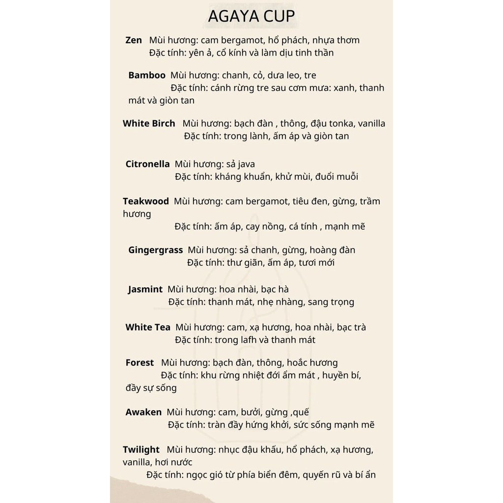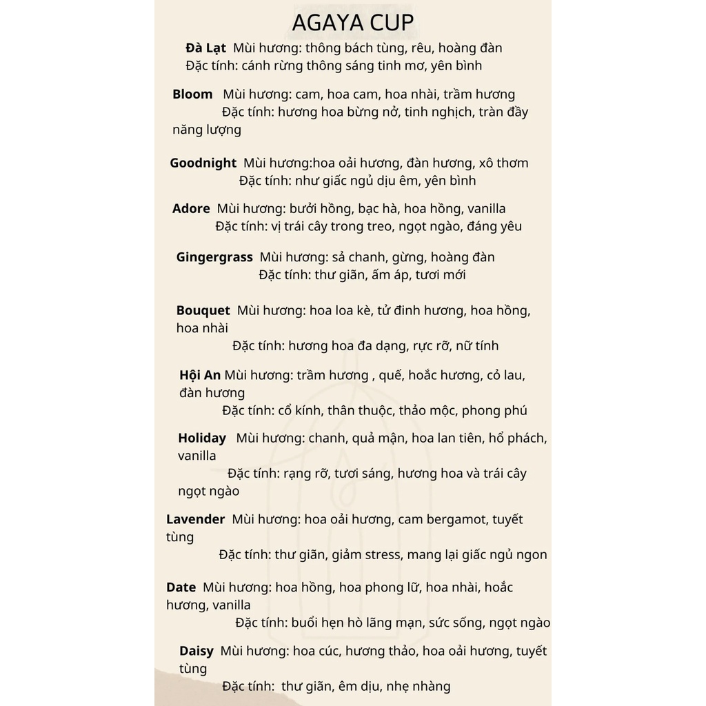 - HỘI AN: trầm hương, quế, hoắc hương, cỏ lau, đàn hương mang sắc thái cổ kính, thảo mộc thư giãn.