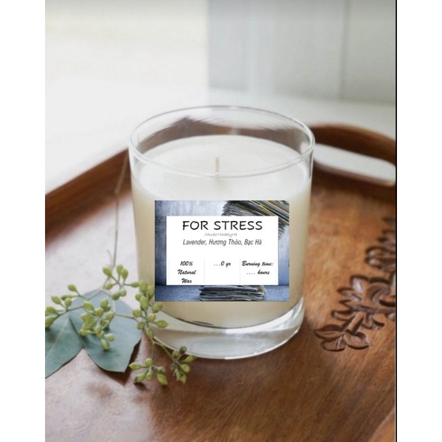 2. Bộ Nguyên liệu tự làm gồm: 1 Ly thủy tinh trong chịu nhiệt kèm Tim Cotton không khói, 1 bộ sáp cọ, 1 lọ tinh dầu For Stress, 1 Tem decal tên Nến và bảng thành phần nến, 1 Bảng hướng dẫn chi tiết các bước làm