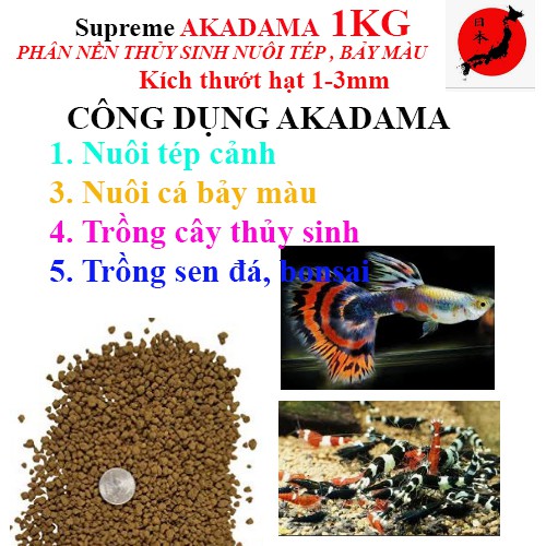 Đất phân nền thủy sinh size nhỏ 1-3mm, chuyên dùng làm phân nền trồng cây thủy sinh, nuôi cá bảy màu rất mau lớn, thời gian phân rã chậm 12 tháng vẫn bình thường. Thích hợp cho các loài cá nhỏ và cá thủy sinh.Akadama là đất được tuyệt trùng ở 300 độ. Akadama có thể kháng lại các loài rêu hại. Akadama giữ phân bón rất tốt vì thế nuôi trồng thủy sinh rất khỏe mạnh. Akadama được dùng để làm phân nền gieo hạt thủy sinh như: Hạt trân châu lùn. hạt kim mao chiên.