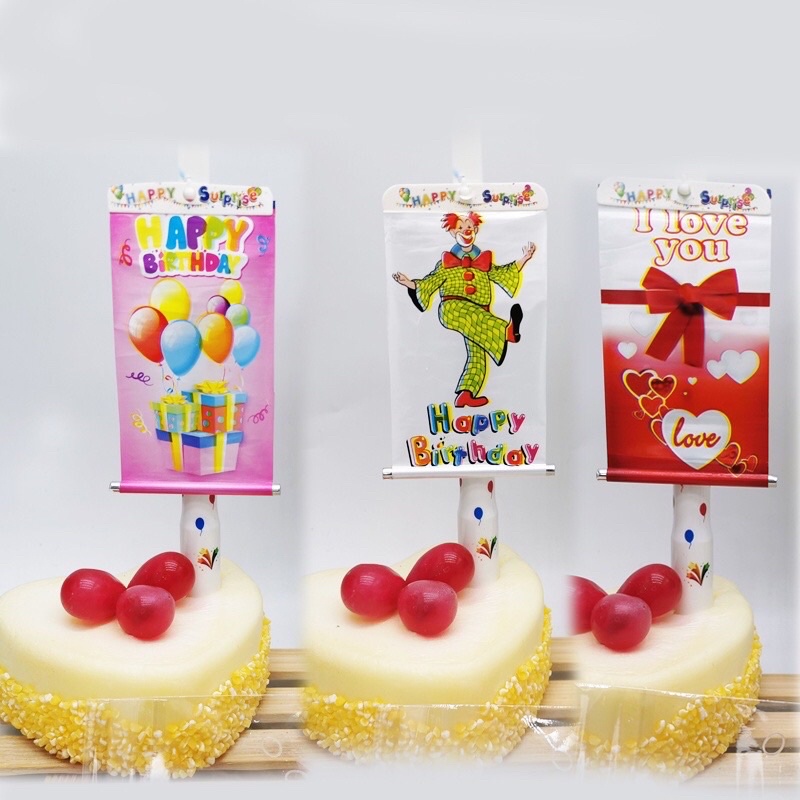 Nến băng rôn kèm theo chủ đề- Mỗi cây nến sẽ có 1 hình khác nhau : Hình chú hề, hình Bóng bay và nơ trái tim