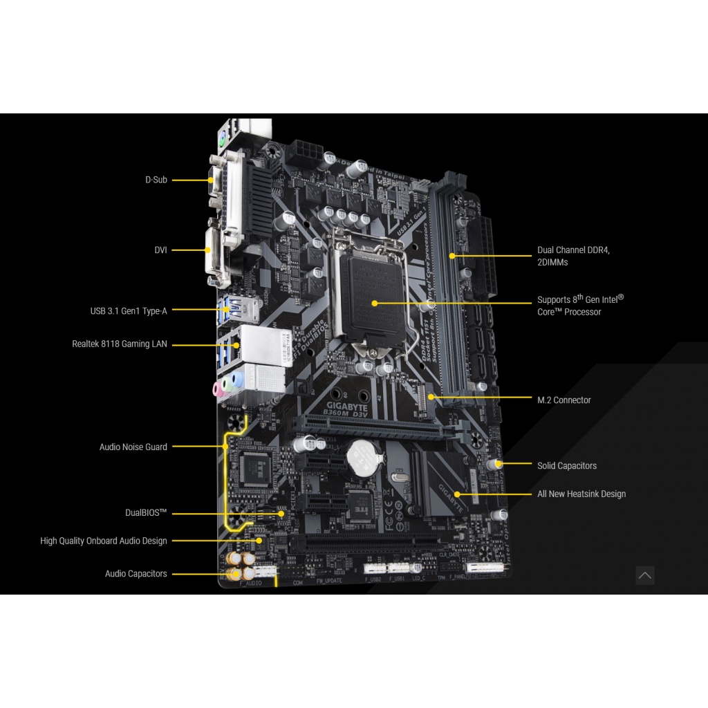 Tính năng khác Intel B360 Ultra Durable motherboard with GIGABYTE 8118 Gaming LAN, PCIe Gen3 x4 M.2, Smart Fan 5, Anti-Sulfur Resistors, DualBIOS™, CEC 2019 ready.