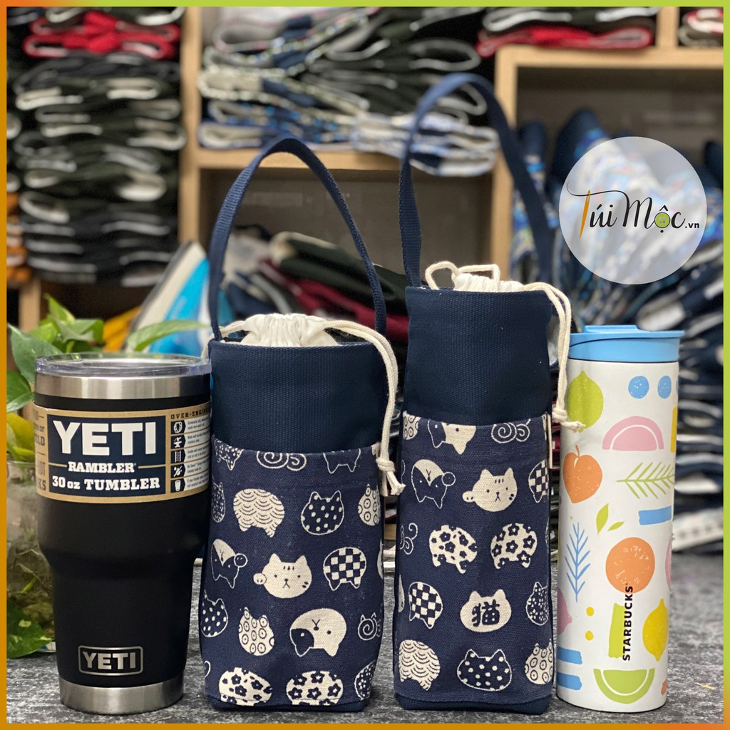 [NEW❤️] Túi đựng Ly/Bình GIỮ NHIỆT bằng vải Canvas DÀY màu Xanh NAVY - Mèo Chiêu Tài DỄ THƯƠNG!!!
