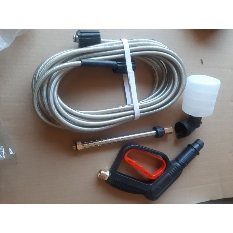 Nhà cửa & Đời sống > Dụng cụ & Thiết bị tiện ích > Dụng cụ > Máy rửa áp lực nước || Bộ ống dây + súng + ống nối inoc +bình bọt dùng cho máy xịt rửa xe áp lực cao ( như hình )Còn hàng