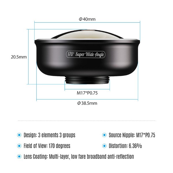 - Toàn màn hình không có cạnh tối: Ống kính góc siêu rộng này là ống kính mắt cá toàn màn hình. Ống kính rộng 170 độ mang lại hình ảnh phẳng không có các cạnh tối.