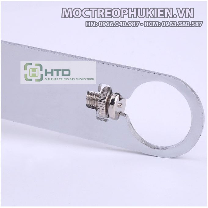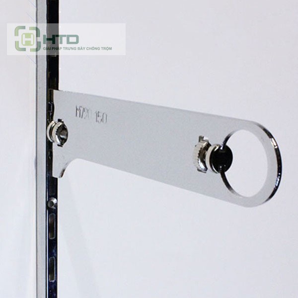 Tay đỡ được thiết kế hai đầu, một đầu gắn vào thanh ray, có ốc vít để xít chặt và dễ dàng di chuyển lên xuống để cho phù hợp với kích thước quần áo trưng bày tại cửa hàng. Đầu còn lại sẽ luồn thanh inox tròn đường kính dưới 2,5cm để móc quần áo lên ống tròn này. Sau khi luồn xong thanh inox tròn chúng ta xít chặ ốc vít lại để cố định thanh inox cho chắc chắn.