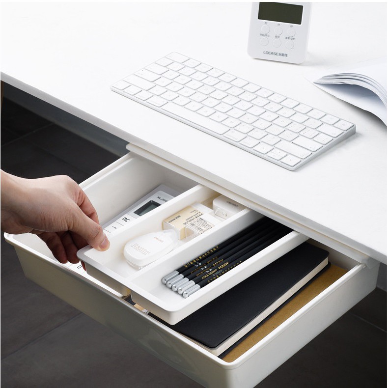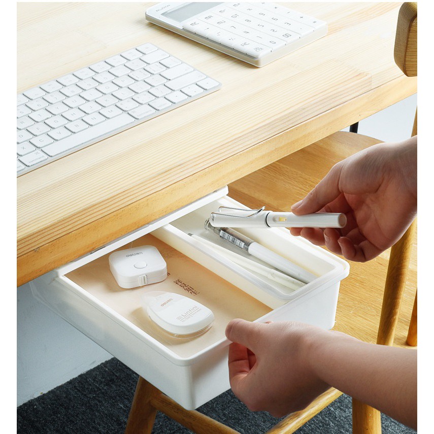 - Hộc dán ngăn bàn có thể chứa rất nhiều thứ như bút, thước kẻ, la bàn, khăn giấy, kéo, điện thoại di động ...vv..- Dung tích chứa đồ lớn không chỉ đựng vừa văn phòng phẩm, mà còn tạo phong cách riêng