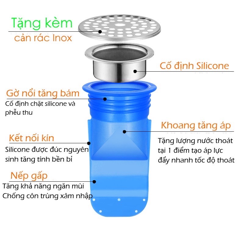 Với cấu tạo là trên to để thu nước, dưới thắt lại để ngăn mùi xông lên từ dưới, chất liệu Silicone siêu mềm, đàn hồi siêu bền cho phép nở ra khi có nước và khép chặt lại khi không có nước, do đó Silicone hoàn toàn ngăn mùi và vi khuẩn, côn trùng trào ngược lên.