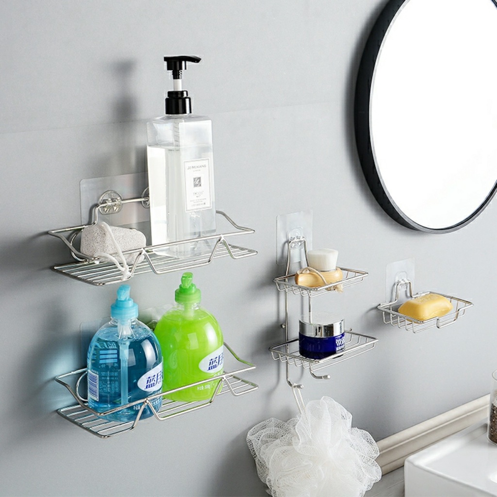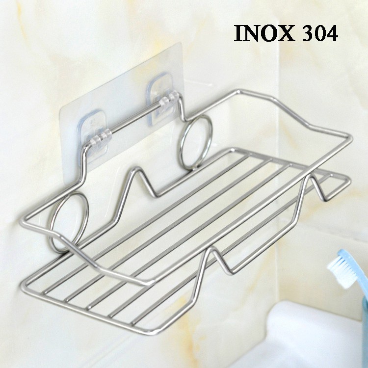 - Bộ sản phẩm gồm 1 kệ inox + miếng dán tường