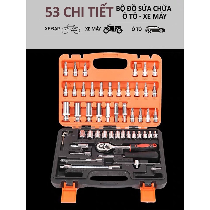 - Bộ dụng cụ đa năng 53 chi tiết sẽ là dụng cụ hữu ích giúp bạn sửa chữa xe máy, xe đạp, ô tô hay trang trí nhà một cách nhanh chóng và tiện lợi nhất.