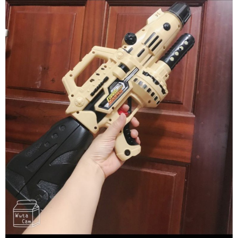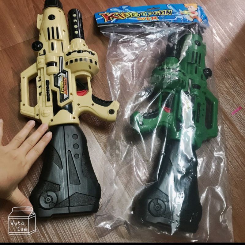 sản phẩm y hình gồm 2 màu be và xanh, có chiều dài 48 cm, bình chứa được 500 ml nước, phun nước xa khoảng 10 mchất liệu nhựa cực dày dặn và bền, phù hợp dùng cho cả người lớn và trẻ em