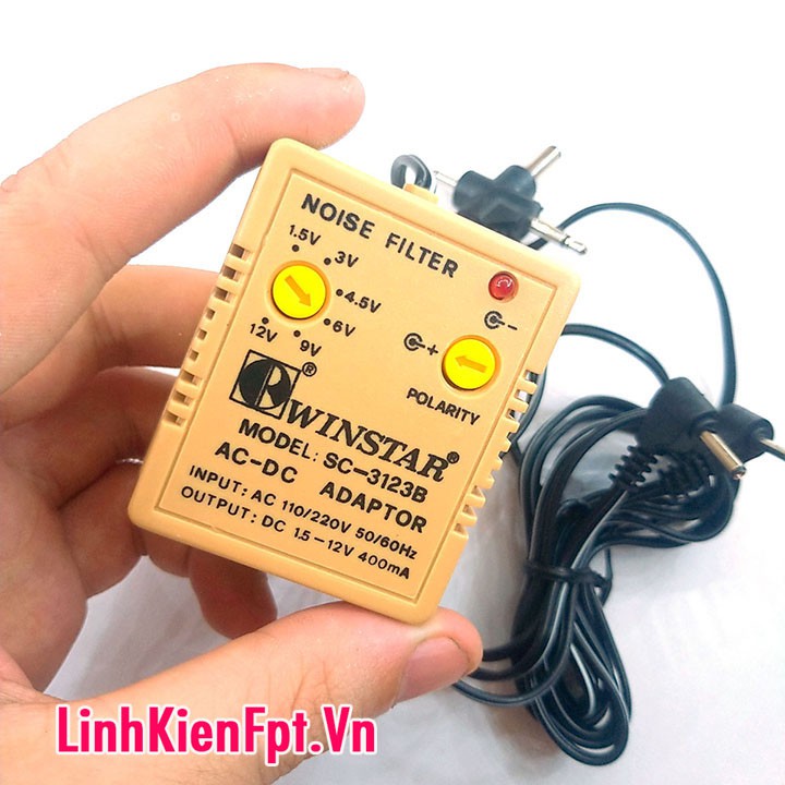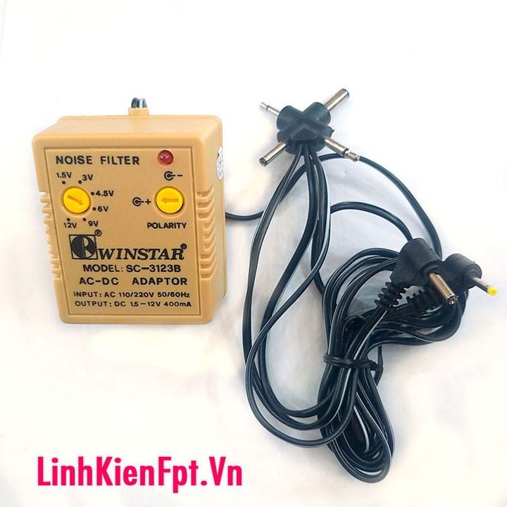 + AC - DC Adapter với các nút điều chỉnh điện áp "NOISE FILTER", cực âm cực dương "POLARITY".