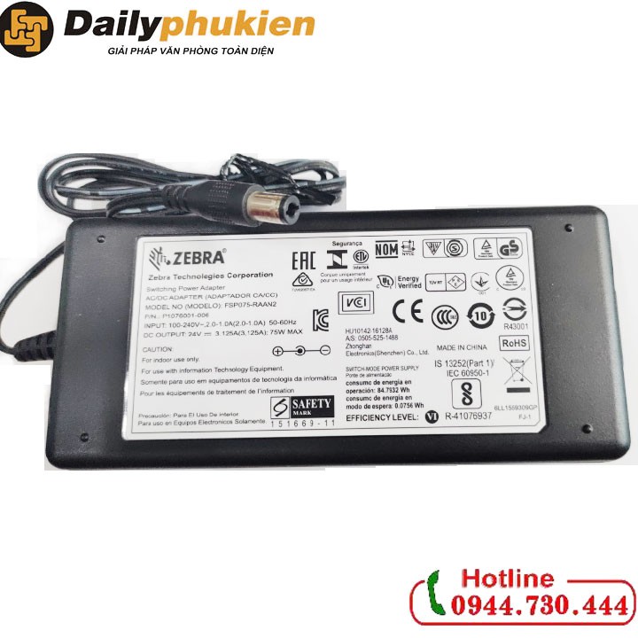 Tên sản phẩm: Adapter nguồn máy in Zebra 24V 3.125AHãng sản xuất; Zebra