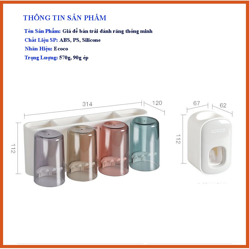 - Quy cách đóng gói: Trọn bộ sản phẩm: 01*Kệ treo bàn chải kèm 4 cốc + 01*Dụng cụ nhả kem đánh răng 1 lỗ