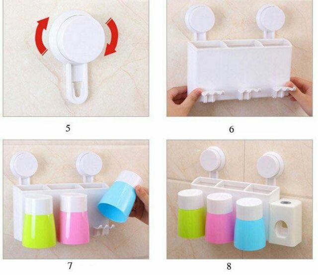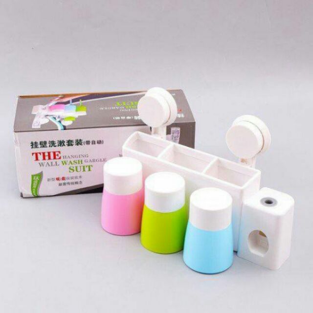 Bộ sản phẩm bao gồm: 1 khay đựng đồ có giá treo bàn chải, khay đựng đồ nhà tắm, dụng cụ nhả kem tự động + 3 cốc khác màu.