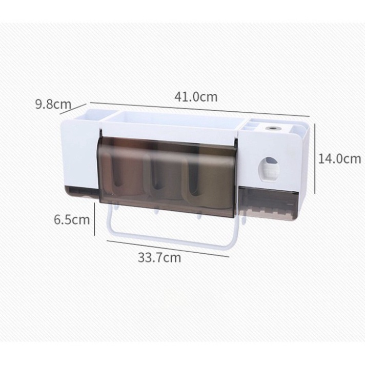 🔹Phía bên trái kệ tích hợp giá đỡ để điện thoại bên trong để các vật nhỏ như bông tăm tai. Và bên phải là phần quan trọng để kem đánh răng với đặc điểm lấy kem tự động và khe lớn để lược rất tiện dụng