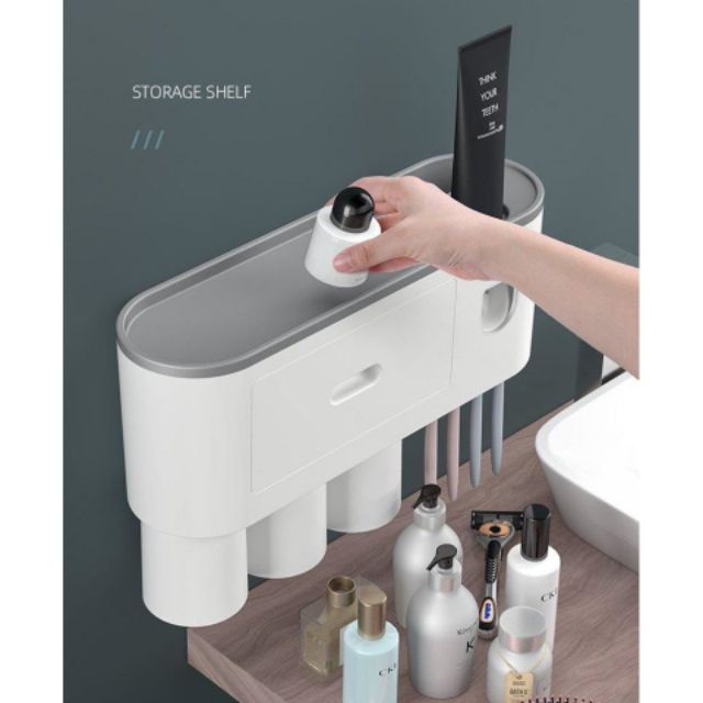 - Sản phẩm gồm: 1 Kệ nhà tắm tích hợp chức năng lấy kem tự động + Cốc hút từ tính + miếng dán tường