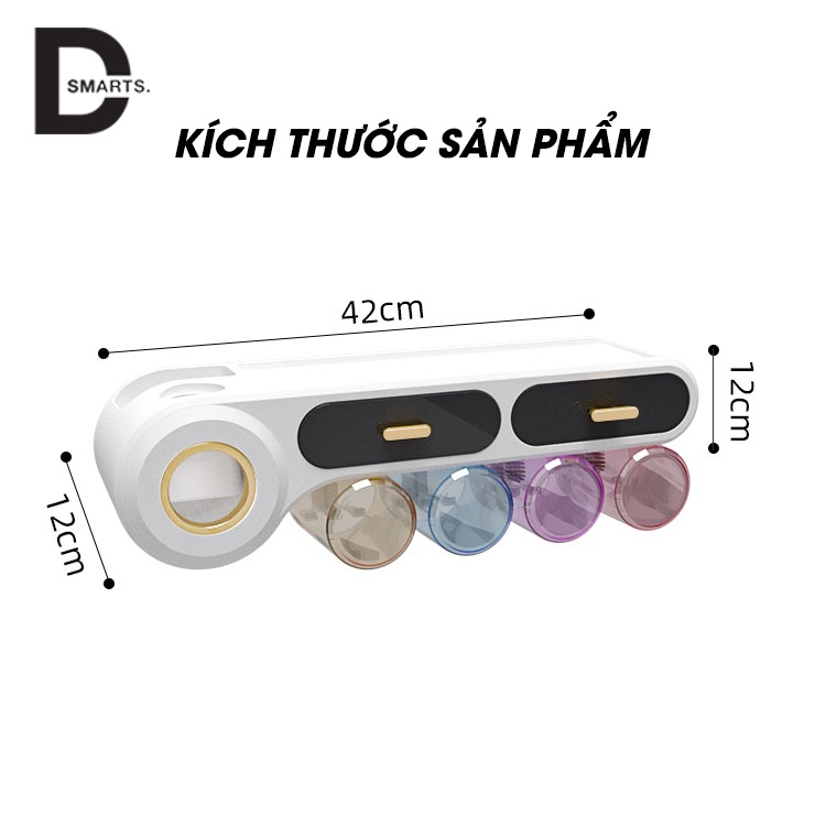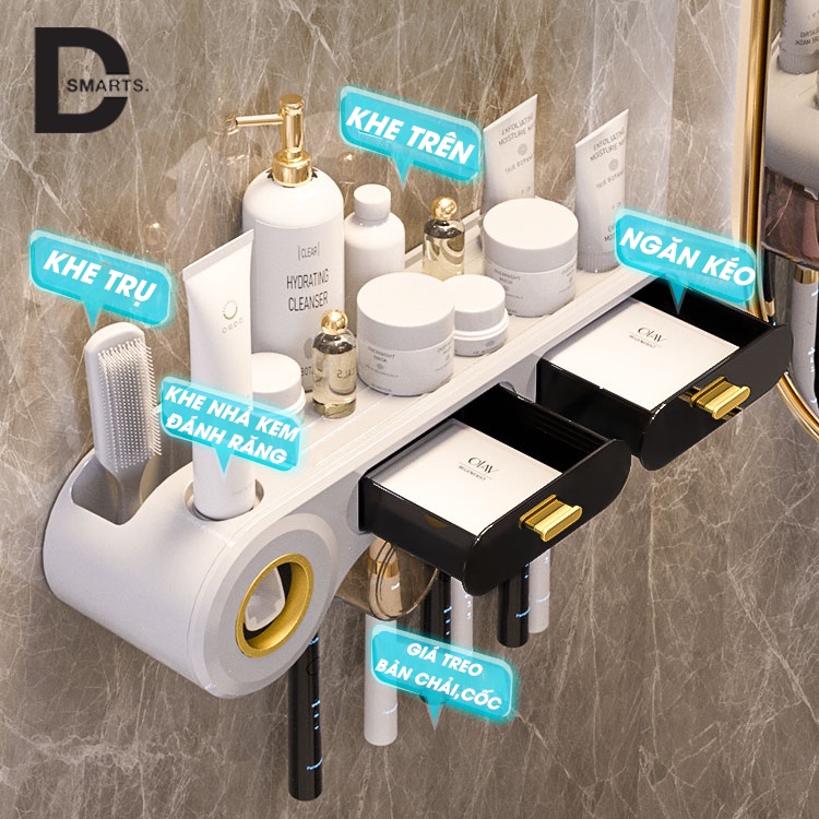 - Sản phẩm gồm: 1 Kệ nhà tắm tích hợp chức năng lấy kem tự động + Cốc + miếng dán tường