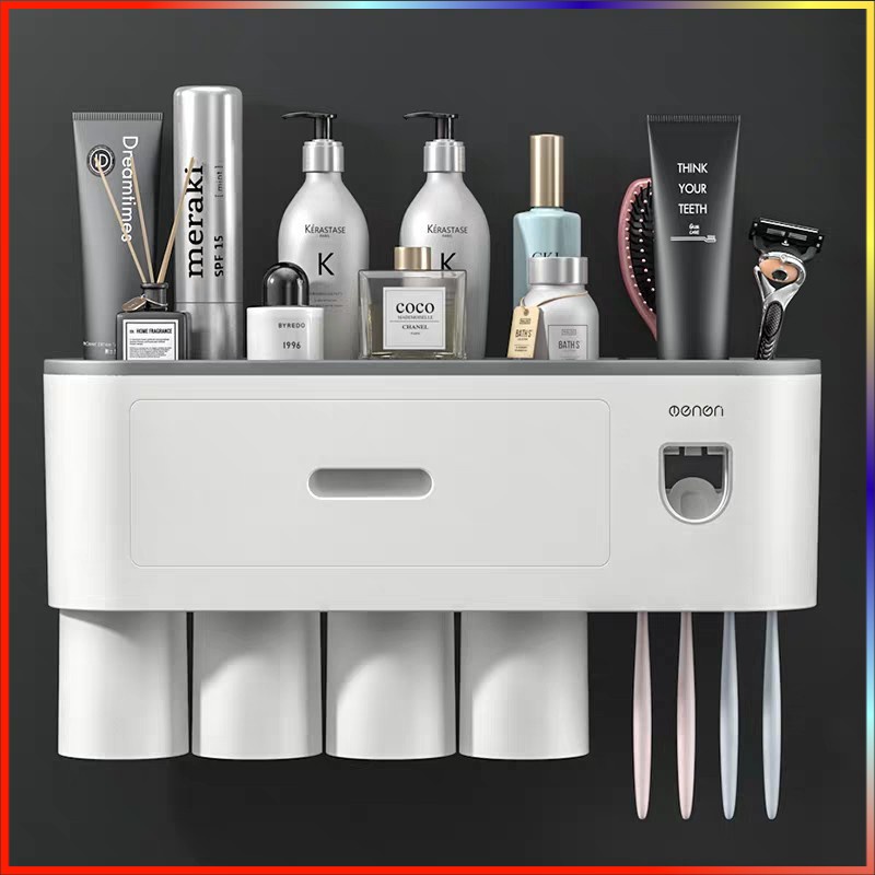 - Sản phẩm gồm: 1 Kệ nhà tắm tích hợp chức năng lấy kem tự động + Cốc hút từ tính + miếng dán tường