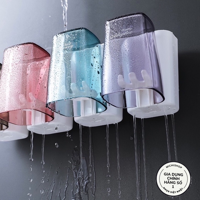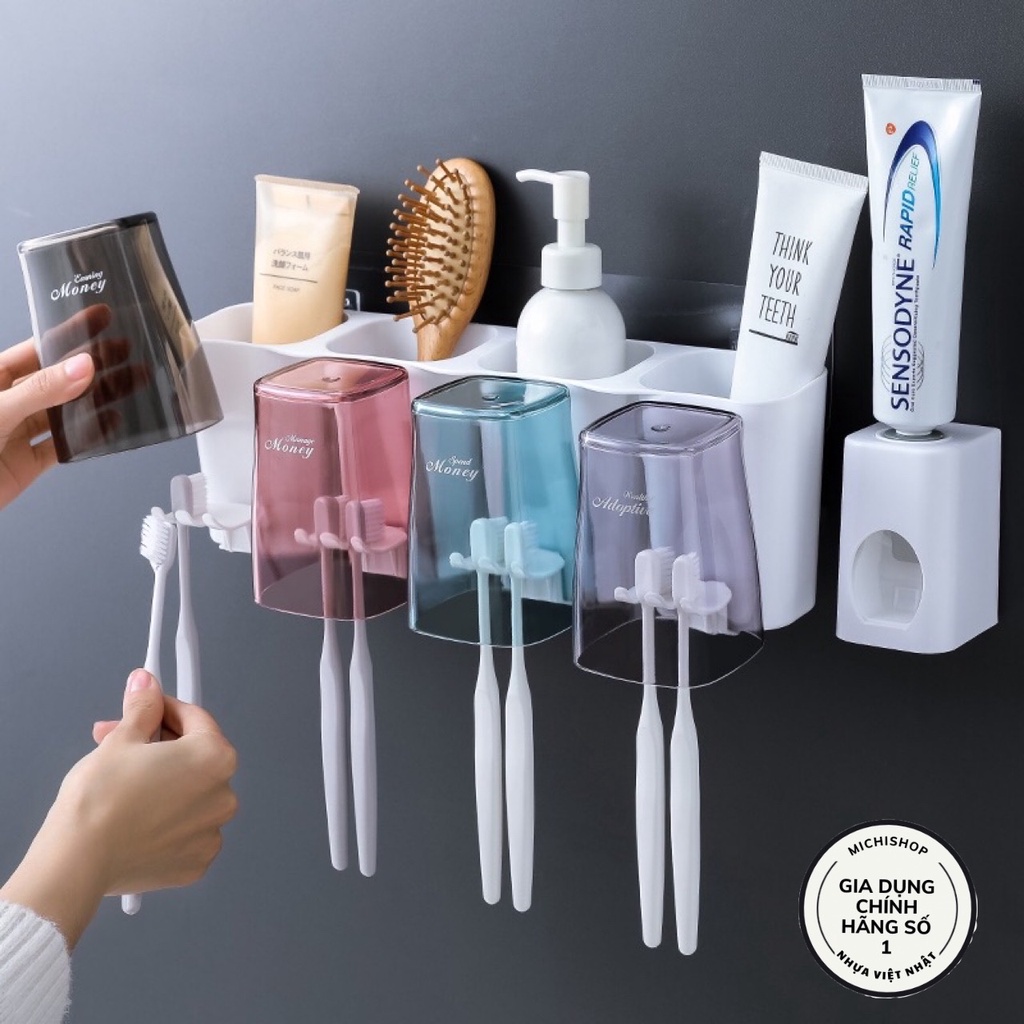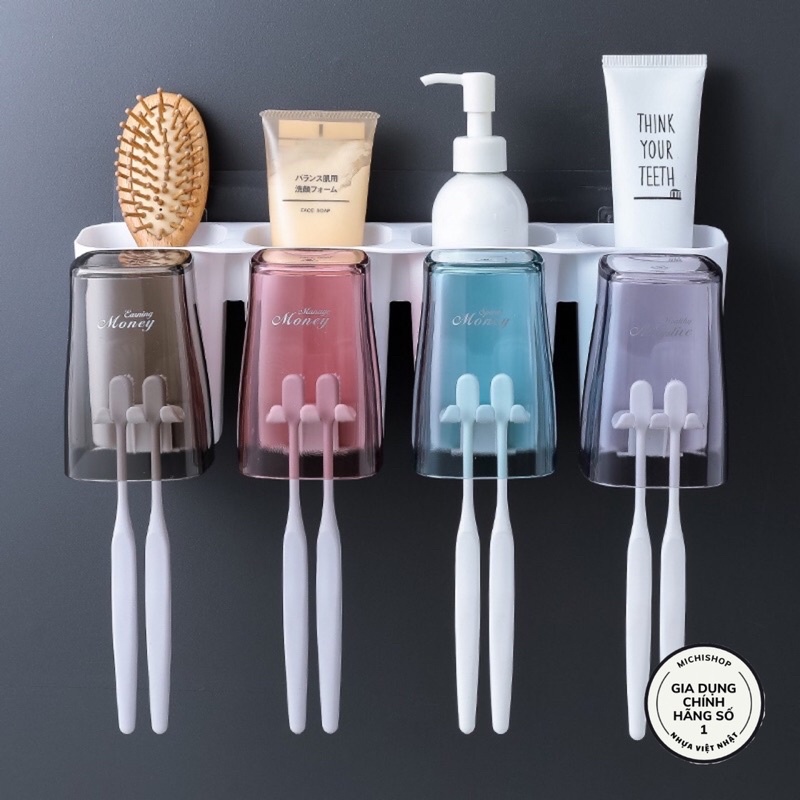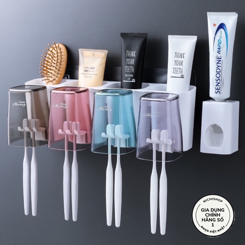 Bộ Nhả Kèm Đánh Răng Tự Động, Kệ Để Bàn Chải Đánh Răng Dán Tường Siêu Chắc 4 Cốc