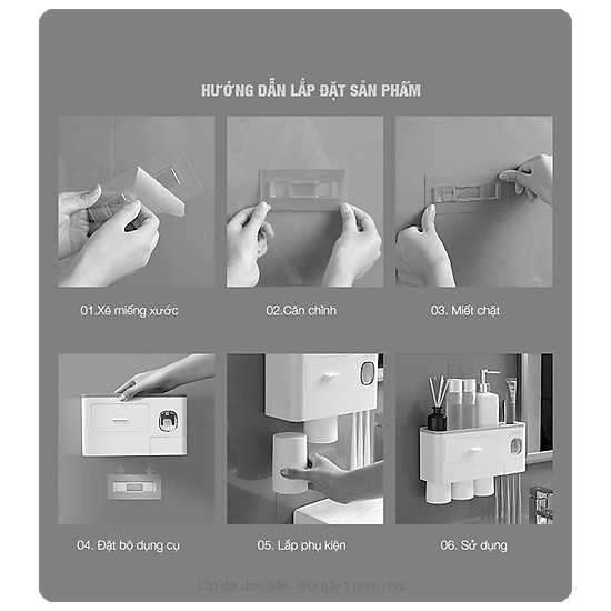 - Sản phẩm gồm: 1 Kệ nhà tắm tích hợp chức năng lấy kem tự động + 2 Cốc hút từ tính + miếng dán tường