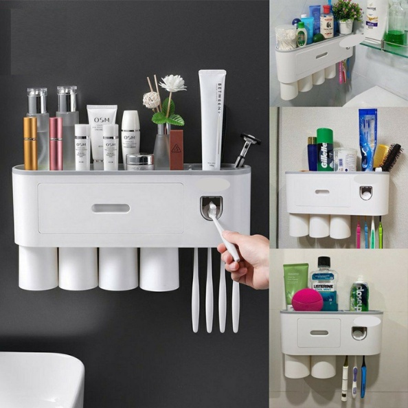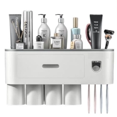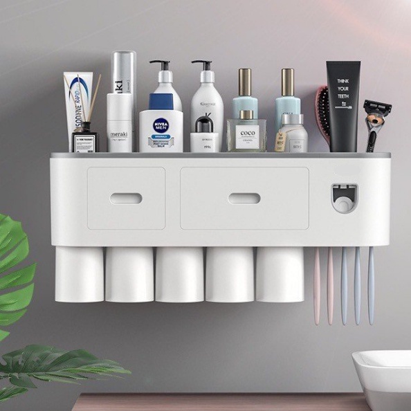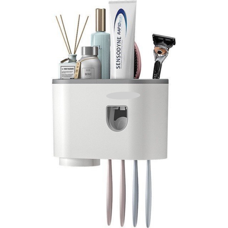 Bộ nhả kem đánh răng tự động kèm cốc kết hợp treo bàn chải. Kệ nhả kem đánh răng kiêm kệ để đồ phòng tắm cao cấp