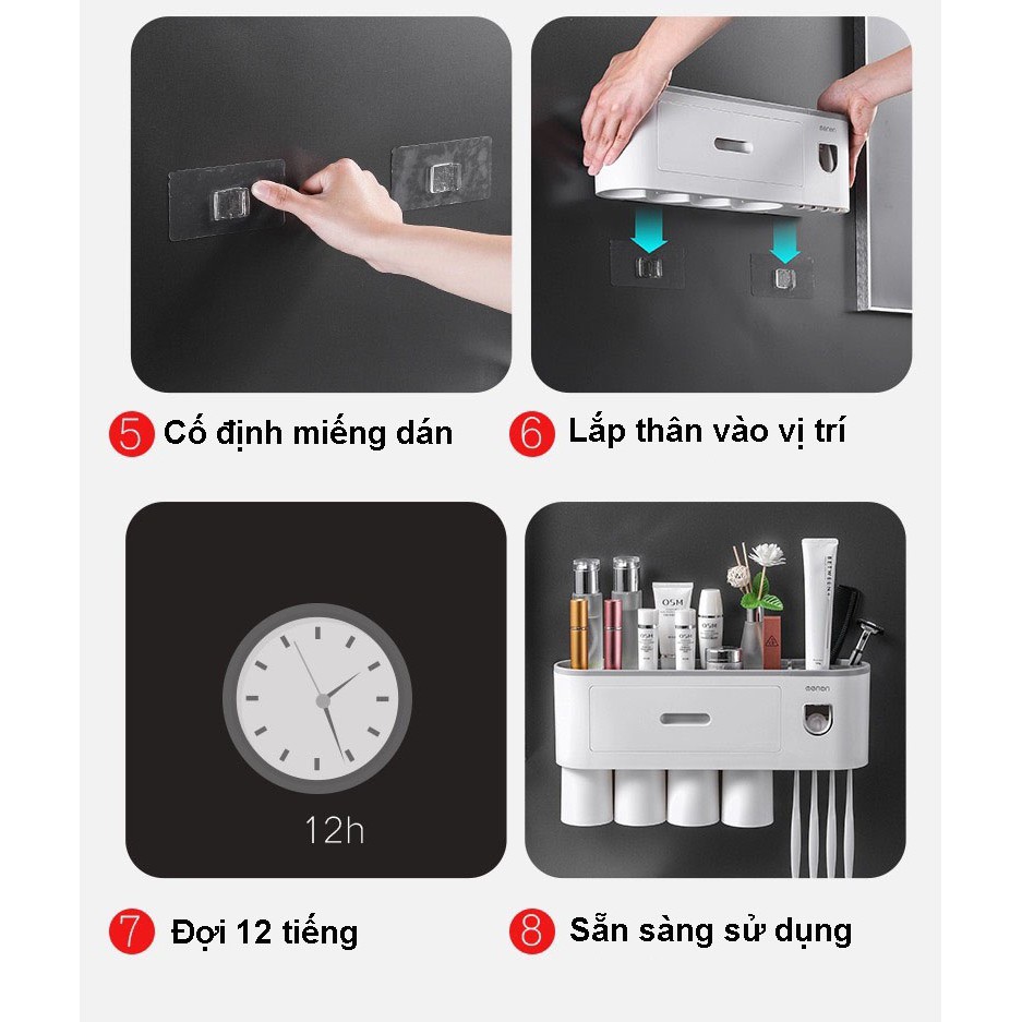 - Kích thước bộ 4 cốc : 42cm x 10cm x 8cm ( có 8 chỗ treo bàn chải đánh răng )