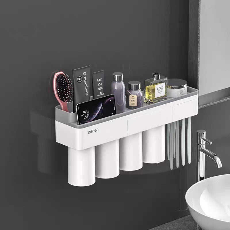 Bộ Nhả Kem Đánh Răng Tự Động Oenon - Kệ treo bản chải kem đánh răng nhà tắm kèm cốc lắp đặt dán tường