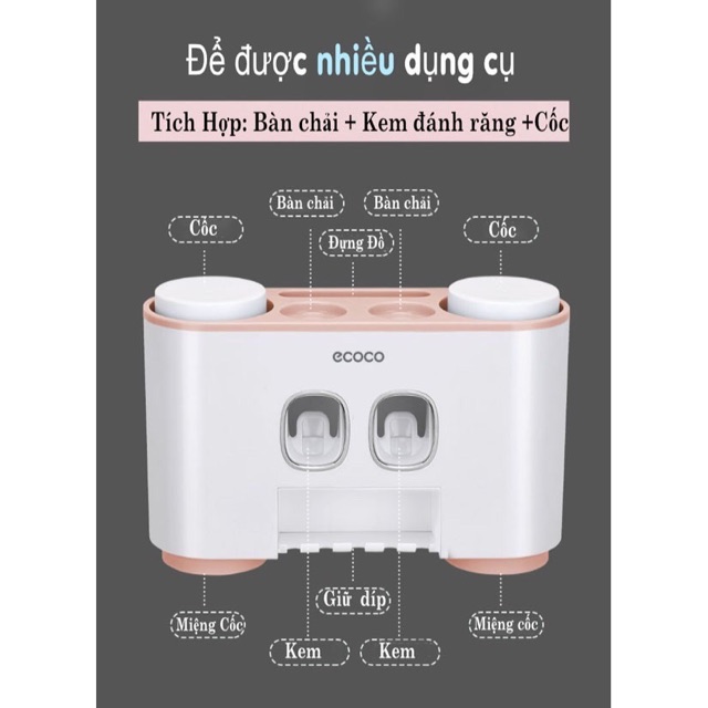 Bộ nhả kem đánh răng tự động Ecoco KHÔNG CẦN KHOAN TỪƠNG, kèm 2 cốc; có thể chứa đựng các vật dụng cá nhân khác trong phòng tắm, với 2 ngăn lấy kèm đánh răng riêng biệt giúp dễ dàng phân loại kem đánh răng của bố mẹ và con giúp việc chăm sóc răng miệng trở nên thuận lợi hơn.