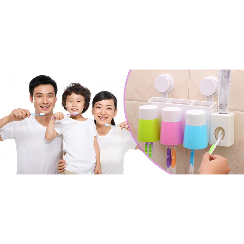 Bộ sản phẩm bao gồm: 1 khay đựng đồ có giá treo bàn chải, khay đựng đồ nhà tắm, dụng cụ nhả kem tự động + 3 cốc khác màu.
