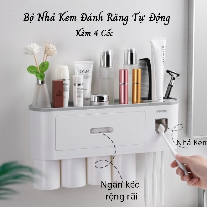 Bộ nhả kem tự động Kệ nhà tắm thông minh oenon kèm 4 cốc nhựa cao cấp