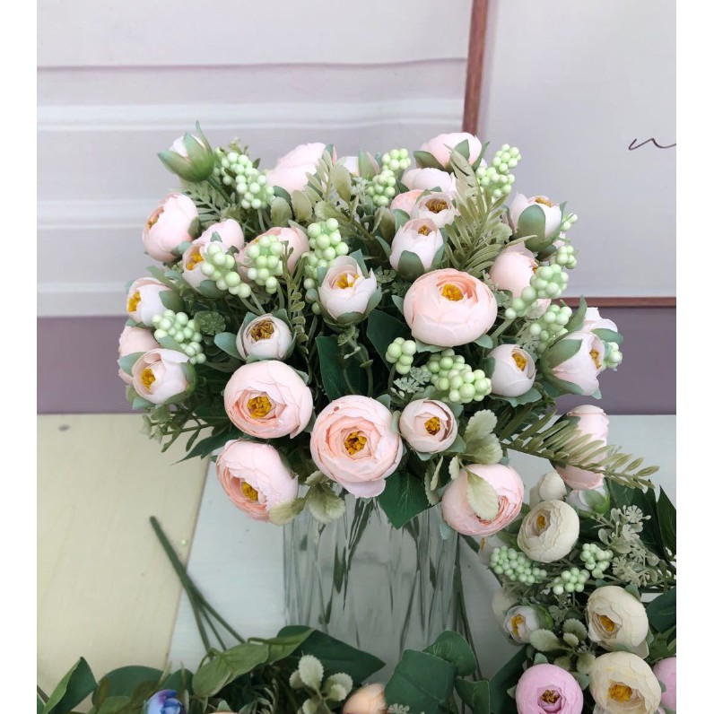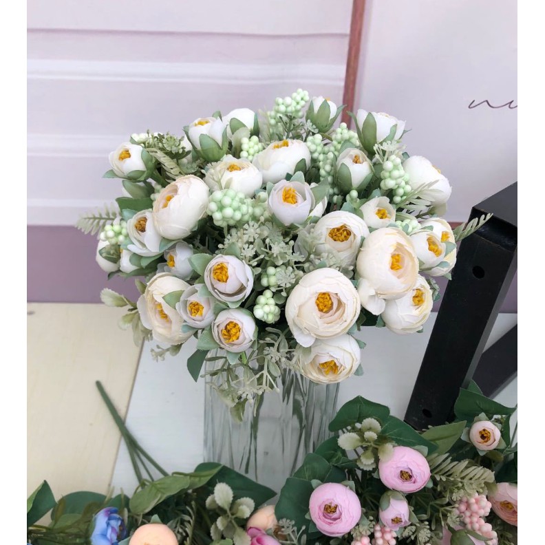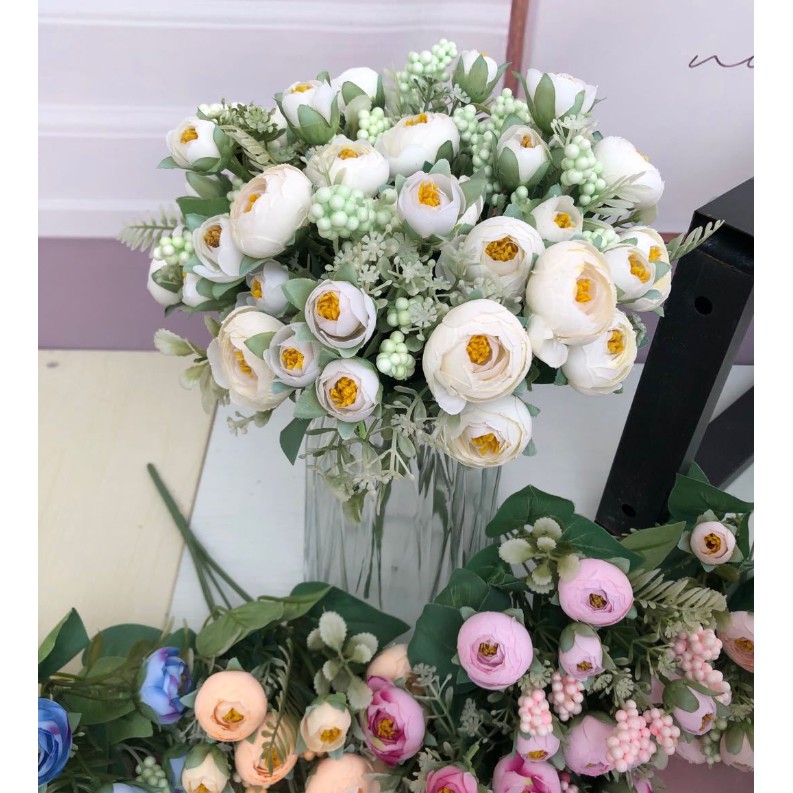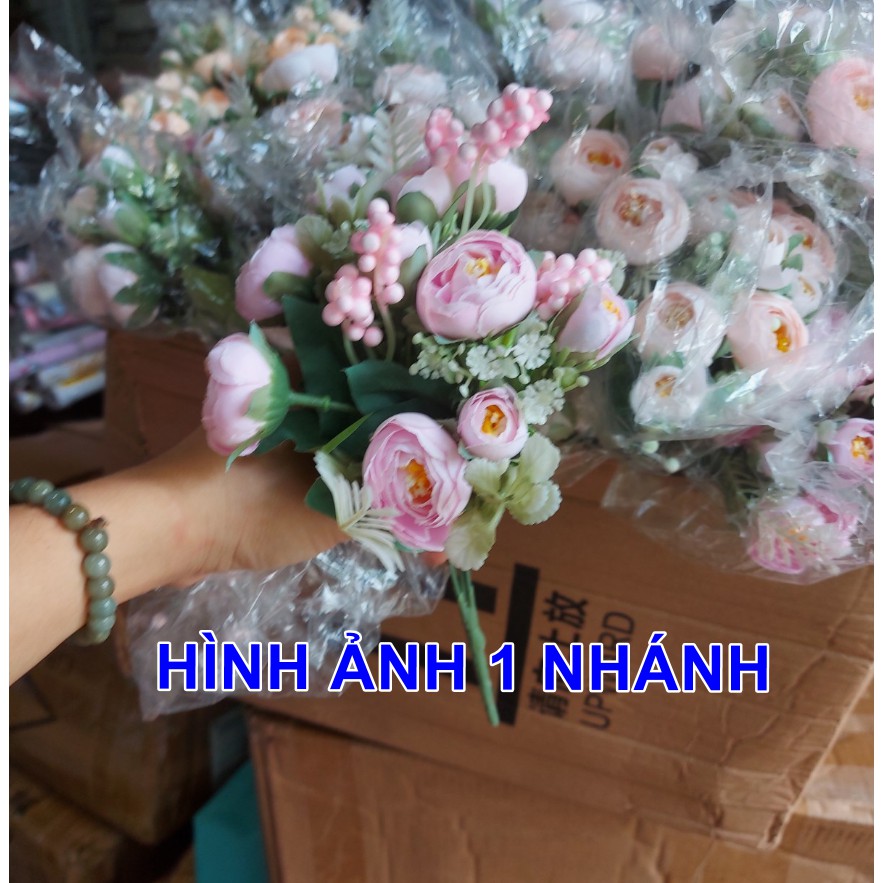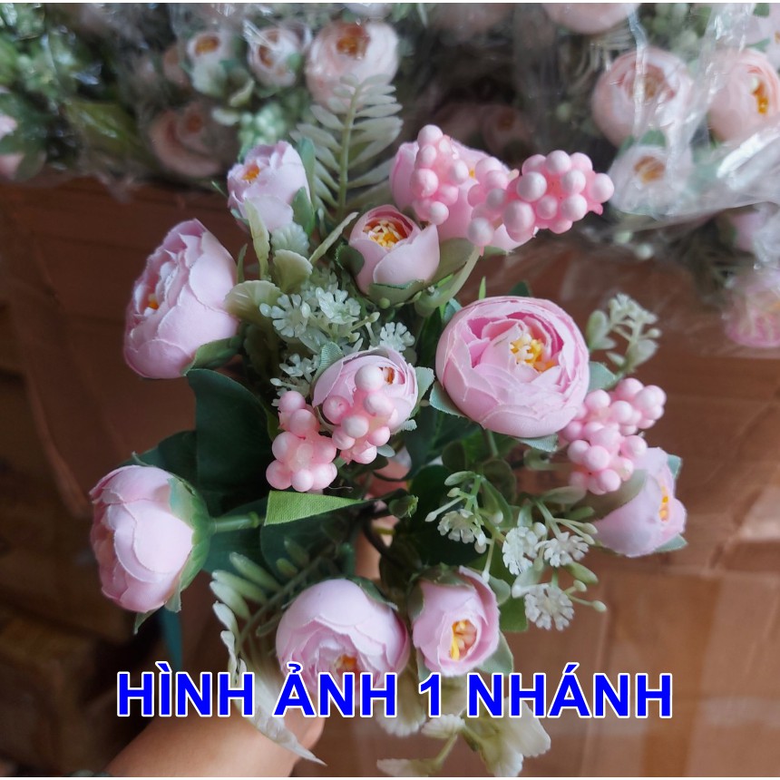 GIÁ BÁN MỘT NHÁNH, KHÔNG PHẢI NGUYÊN BÌNH, KHÔNG CÓ BÌNH CẮM BÔNG. CẮM ĐƯỢC NHƯ HÌNH MẪU TẦM 5 NHÁNH BÔNG.1 nhánh 10 bông kèm lá và hạt xốp như hình, chiều cao cành 30-35cm, đường kính hoa 3cm - 5cm