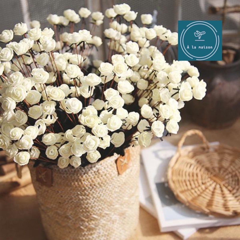 Giới thiệu Nhánh hoa hồng 15 bông nhí cao 50cm dùng trong decor trang trí theo phong cách vintage