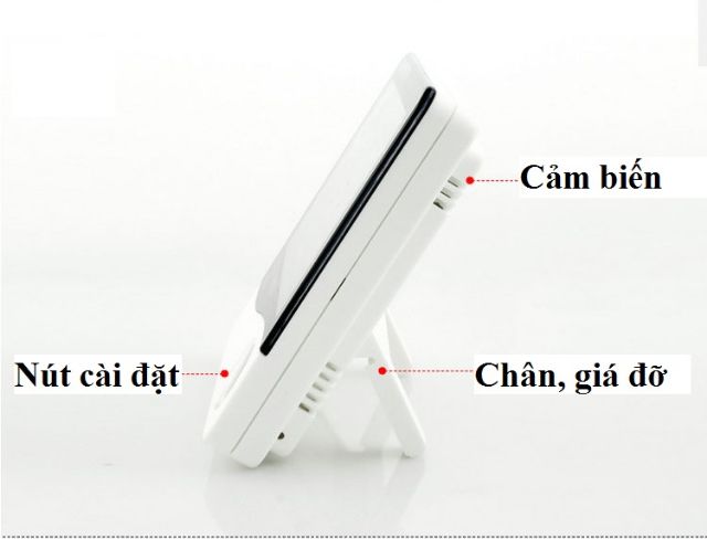 - Hiển thị bằng màn hình LCD to, rất rõ ràng. Có 3 chức năng là đồng hồ, nhiệt kế điện tử và ẩm kế điện tử.