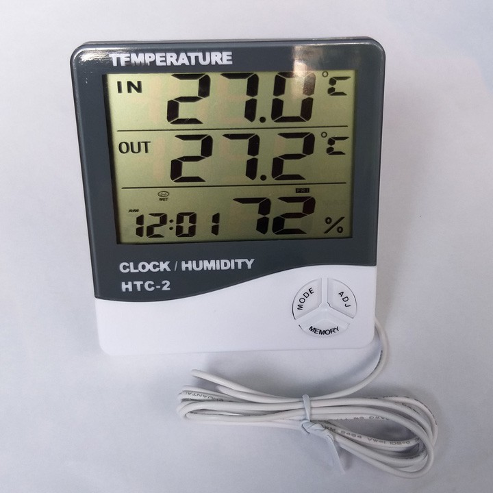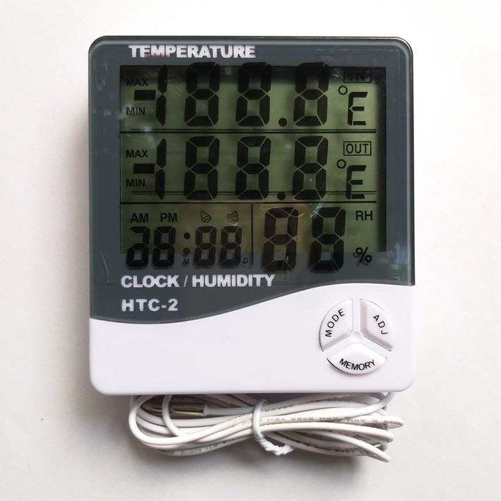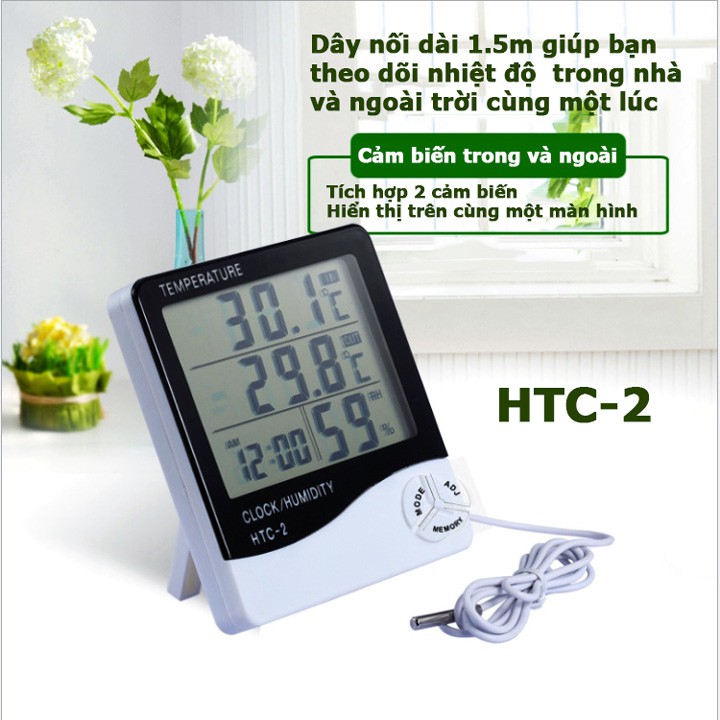 Nhiệt ẩm kế kiêm đồng hồ báo thức cảm biến nhiệt độ và độ ẩm HTC-2 với 2 cảm biến trong và ngoàiCảm biến nhiệt độ và độ ẩm HTC-2 với dây cảm biến nối dài 1.5m giúp bạn theo dõi được cả nhiệt độ trong phòng và ngoài trời cùng một lúc trên một màn hình.